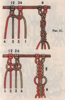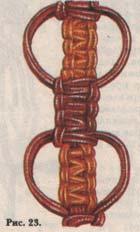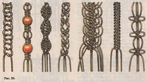 Шнуры из плоских узлов. Они бывают плотные или наоборот, ажурные, похожие на листики или украшенные бусинами, керамикой, кольцами (рис. 20). ![]()