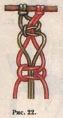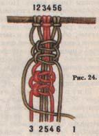 Если навесить узелковые нити одного цвета, а рабочие — другого, то получится шнур с разными по цвету узлами. ![]() Плотный двухцветный шнур с «пико» (рис. 23). ![]() Он сплетён из шести концов: 2 красного цвета и 4 — жёлтого. Закрепляя нити, распределять их надо как показано на рис. 24. ![]()