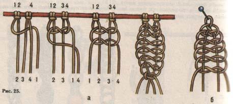 Листообразный шнур. Такой шнур получается из переплетенного или фигового узла. Закрепите на основе 2 метровые нити, перепустив концы длиной 20 и 80 см. Возьмите левой рукой левую рабочую нить (1-ю), согните ее под прямым углом (рис. 25 а), положите сверху на узелковые (2-я и 3-я) и под правую рабочую нить (4-ю).
