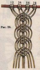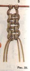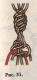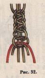 При плетении шнуров рабочие нити могут закончиться быстрее, чем нужно, тогда поменяйте их местами с узелковыми (см. рис.22). Если этого будет недостаточно, то возьмите новую рабочую нить: для витого шнура введите её в последний узел (лучше, если он ещё не повернулся на ребро), в котором кончились нити, и протяните за узелковыми (рис. 31).