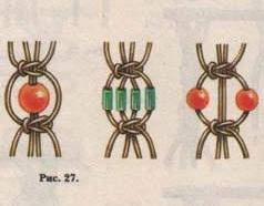 Шнур с бусинками. Бусины, деревянные шарики от детских игрушек, куски бамбука, вплетённые в шнур, сделают его нарядным, декоративным. Закрепить отделку просто: проденьте узелковые нити через отверстие в предмете и завяжите под ним двойной плоский узел (рис. 27).