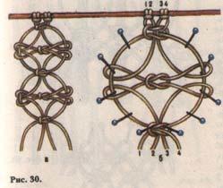 Приготовьте 2 толстые упругие нити (структура узла будет виднее) длиной 60—70 см, сложите их пополам, закрепите на основе и сплетите двойной плоский узел. Далее рабочими нитями выложите круг, приколов его булавками, а узелковыми сплетите геркулесов узел, уложив нити, как показано на схеме (рис. 30 б). Круг снизу закрепите двойным плоским узлом.