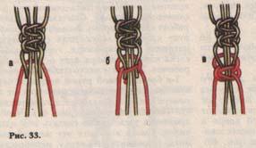 Можно сделать и иначе. Сложите пополам новую нить и приложите петлей сзади узелковых и коротких рабочих нитей — образовалось 2 новых рабочих конца (рис. 33). Сначала потуже завяжите левый одинарный узел (если предыдущий был правый), а затем правый — новые нити закреплены двойным плоски узлом.