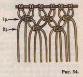 2-й ряд — отодвиньте 2 первые нити слева и, отступив вниз от 1-го ряда 5— 7 мм, на каждых следующих четырёх нитях завяжите по 1 узлу, располагая их на одном уровне — образовалось 2 узла (последние 2 нити остались непровязанными, рис. 34).