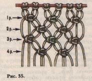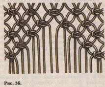3-й ряд — введите в работу по 2 крайние нити, оставленные во 2-м ряду, и сплетите 3 узла (как 1-й ряд). Продолжайте плетение, оставляя между узлами одинаковые промежутки (рис. 35).