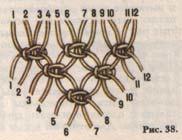 Сетку плетите до вершины ромба; там, где намечен ромб (рис.36), узлы не завязывайте: сначала один узел (вершина ромба), в следующем ряду под ним ещё 2 в шахматном порядке, потом 3 узла и так продолжайте, пока получите нужную ширину ромба.