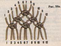 Если выполняют шестигранник, то, наоборот, начинают с одного узла (рис. 38 а): на четырёх средних нитях завязывают 1 двойной плоский узел, распределяют под ним нити по 2 и, добавив ещё по 2 свободные с краёв, завязывают под первым узлом в шахматном порядке 2 двойных плоских.