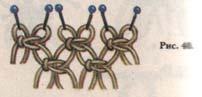 В этом узоре узелковые и рабочие нити после каждого ряда меняются местами, поэтому расходуются одинаково. Концы должны быть длиннее изделия приблизительно в 3—3,5 раза.