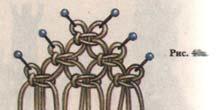 Сетка-мережка (рис. 39). Её выполняют, перекрещивая рабочие нити в каждом ряду. Длина рабочих нитей больше узелковых в 4—6 раз.