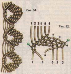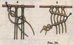 Закрепите на основе 3 сложенные пополам нити по 1,5 м. Возьмите в правую руку крайнюю левую нить и натяните слева направо под углом 45° поверх остальных, место сгиба заколите. Поочередно каждой нитью завязывайте левой рукой диагональный репсовый узел на натянутой узелковой (рис. 50 а).Сплетите ряд до конца, переложите узелковую нить в левую руку и поверните под наклоном справа налево, место сгиба заколите.