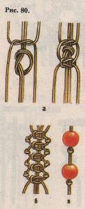 Утолщённая цепочка «змейка» из шести и более нитей плетётся нетугими узлами, похожими на кольца (рис. 86, д).