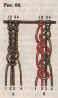 Двухцветная двусторонняя цепочка из петельных узлов выполняется разноцветными рабочими нитями (рис. 88, 6). Сначала одной рабочей (4-я) завязывают 1 узел на одной узелковой (3-я), следующий — на двух (3-я и 2-я). Затем другой рабочей (1-я) завязывают 1 узел на одной узелковой (2-я), следующий — на двух (2-я и 3-я). И так повторяют, чередуя рабочие нити разных цветов.