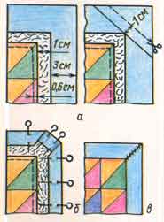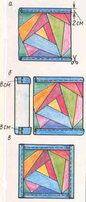 2. Остаток уголка отворачивают на лоскутный верх, а срезы подкладки подгибают на 1 см и закалывают (рис. 2, б). Они должны коснуться краев ватина.
