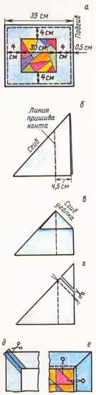 Далее начинают готовить подкладку: отмечают на ней линию пришива канта и затем складывают пополам любой из углов лицевыми сторонами внутрь и проглаживают сгиб (рис. 3, б).